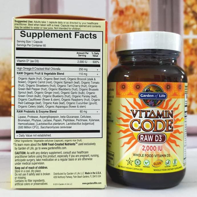By Garden of Life. Garden of Life Vitamin D Vitamin Code Raw D3 Vitamin D 2000 IU Raw Whole Food Vitamin D Supplements with Chlorella Fruit Veggies Probiotics for Bone Immune Health 60 Vegetarian Capsules.