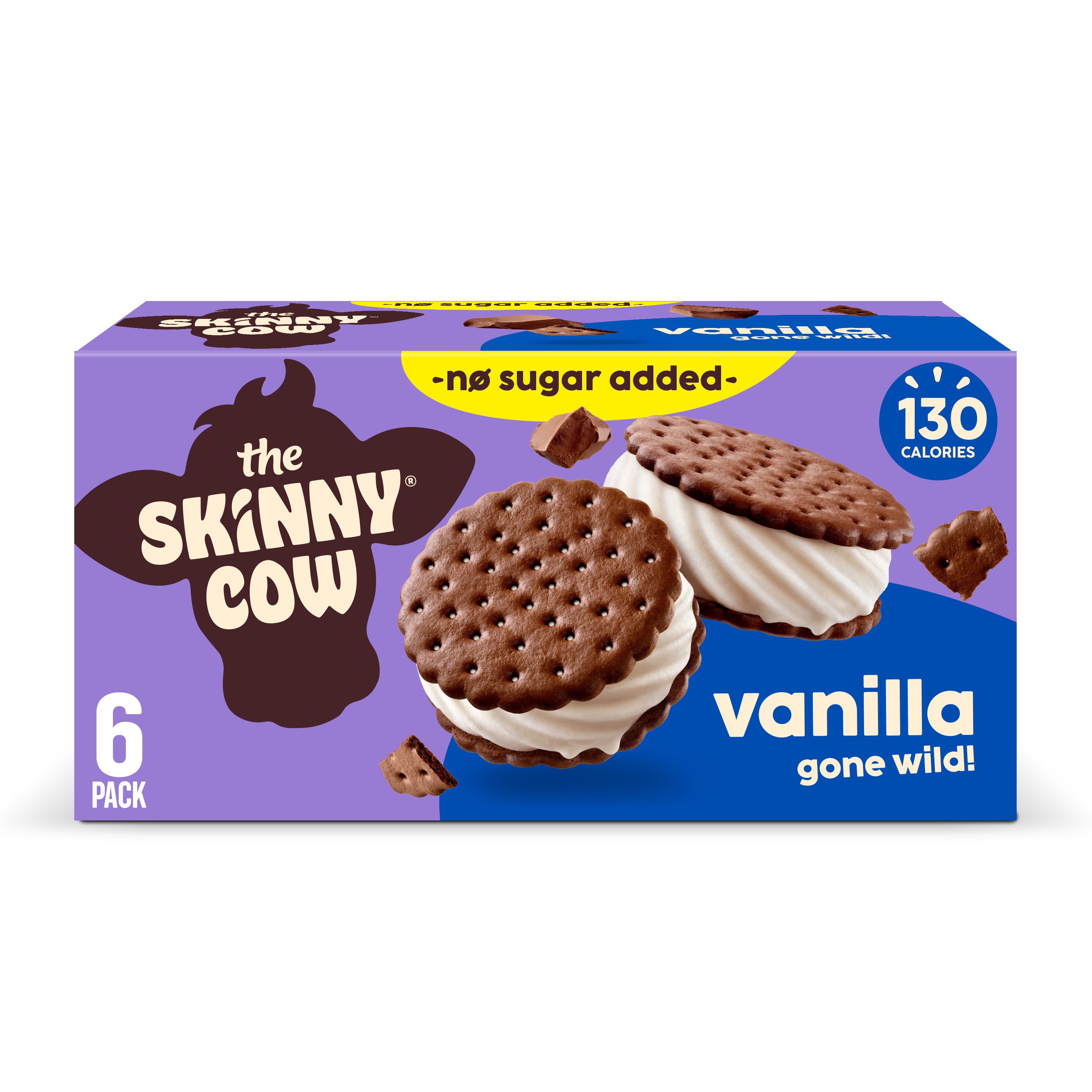 These ice cream sandwiches are so good you cant even tell theyre sugar-free. Their vanilla ice cream is made with real vanilla bean meaning youll taste those delicious dark seeds in every scoop. Skinny Cow No Sugar Added Vanilla Gone Wild ice cream sandwiches are made with creamy low fat no-sugar-added vanilla ice cream sandwiched between two big chocolatey wafer cookies.